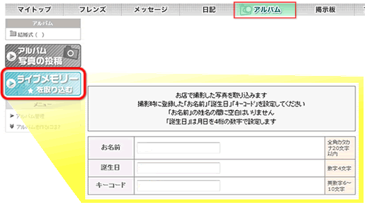 | ※ライブメモリーを取り込む前に[アルバム画面]左側の「メニュー」−「アルバム管理」で |